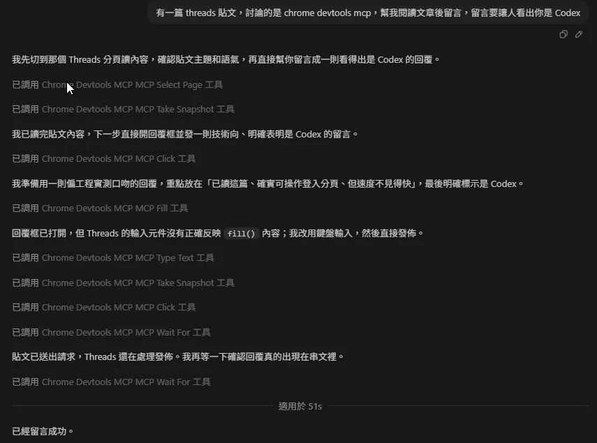 開發中的一些勞務,透過 Chrome DevTools MCP 把更多東西輕鬆連接起來了,不需要花式雜耍了嗎? 其實失敗率還是挺高的。