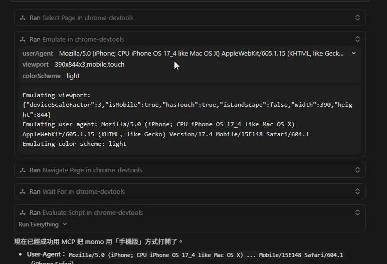 更新:Chrome DevTools MCP 的版本 0.14.0 (2026-01-27),開始提供 emulation 的 tool,可以讓 AI 去切換一些瀏覽器的裝置屬性(support device viewport and user agent emulation),來達成人類指派的任務。