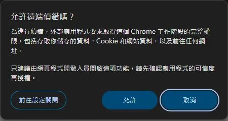 應該暫且不用擔心什麼瀏覽器在偷偷進行不為人知的操作,AI 要操作網頁時,會跳出一個權限確認視窗(如下圖),瀏覽器視窗上方也會掛著一條「Chrome目前受到自動測試軟體控制」的提示。