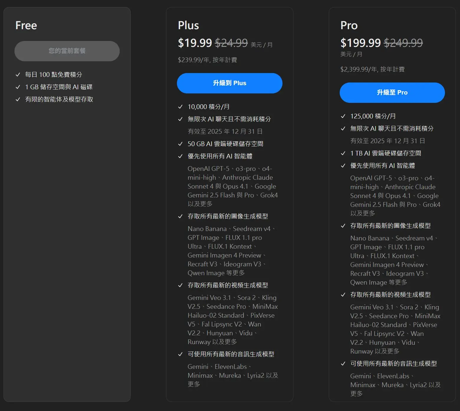 從一個平台就能用到很多其他家的 AI,也有不少自己原創的 AI 功能,每日免費積分+全家餐式的服務讓人很難抗拒。