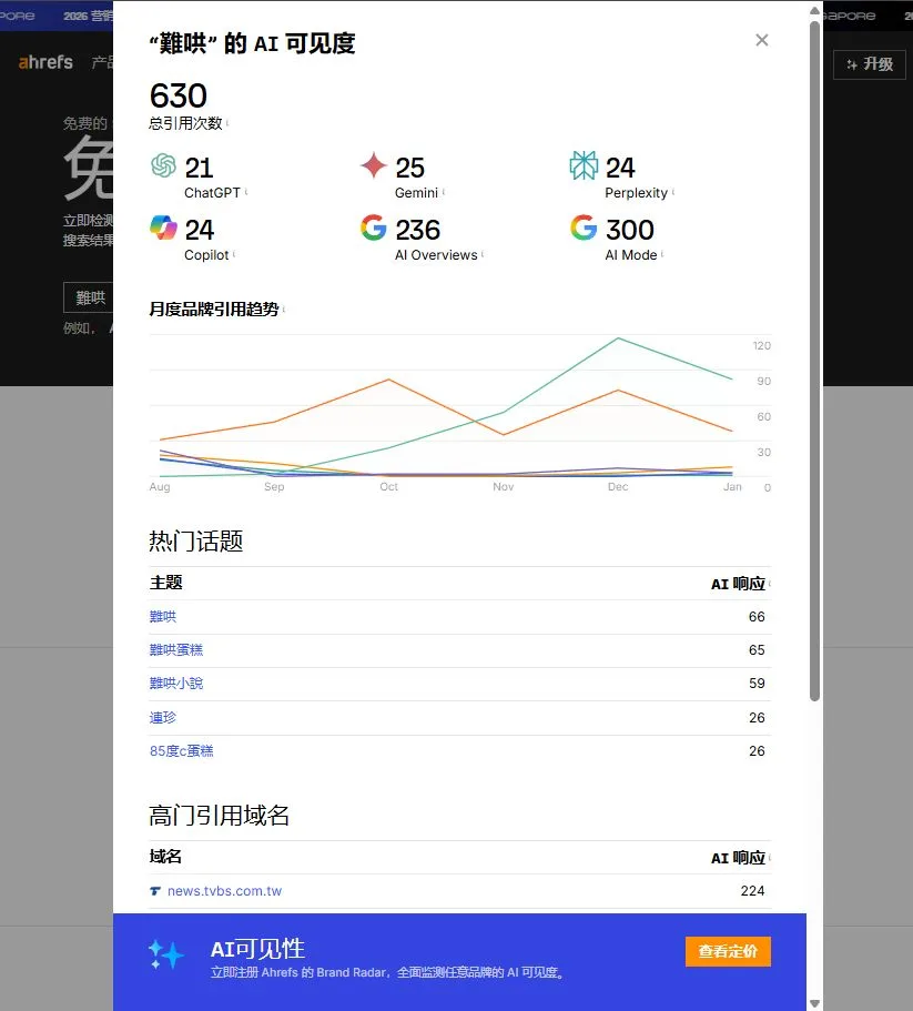 會顯示 AI Overview、ChatGPT、Perplexity、Gemini、Copilot 這5家AI的引用次數,還有被引用的網頁數量。但是點進去都會連到 Brand Radar,要付費才能看到詳細資料。