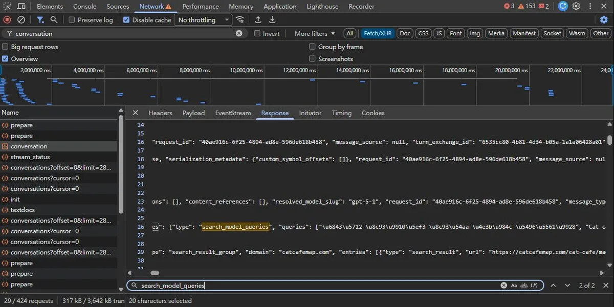 1.有人從 ChatGPT 發出的 request 中的 search_model_queries (下圖中的\u6843\u5712\u8u93\u9910\u5ef3 可以還原成中文字)發現可以看到AI都用什麼字詞去搜尋
