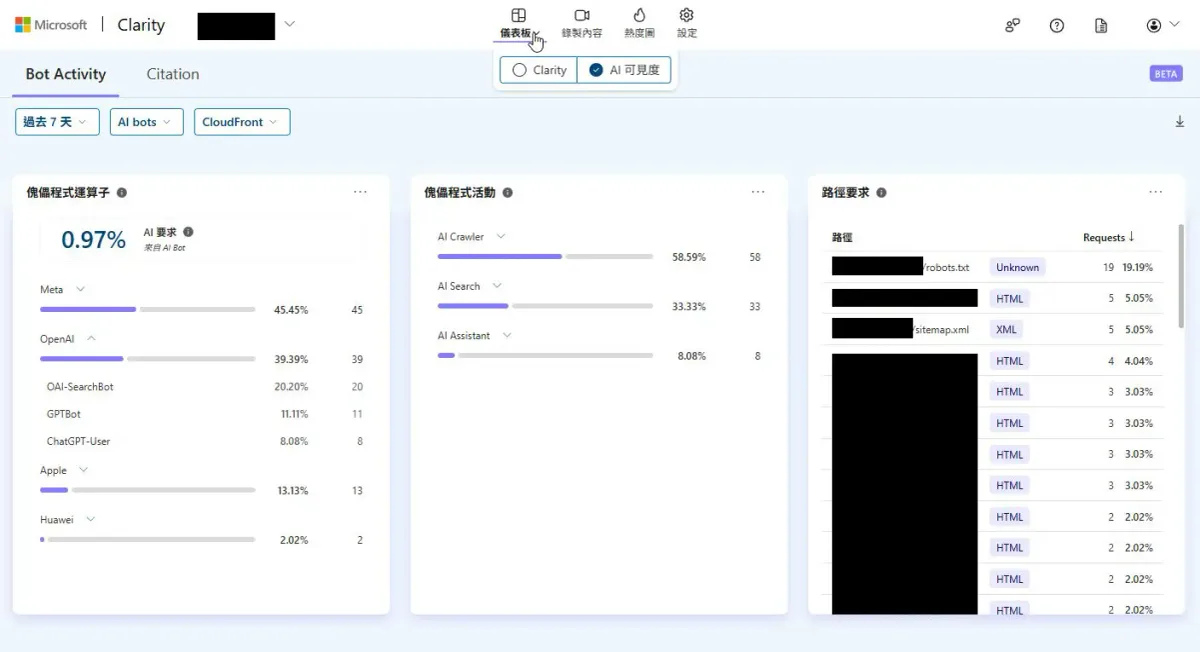 2026年初的時候。微軟的另一個產品 Microsoft Clarity 也全民公測了一個新功能: AI Bot Activity。官方介紹AI Bot Activity in Microsoft Clarity: See How AI Really Accesses Your Site