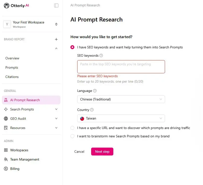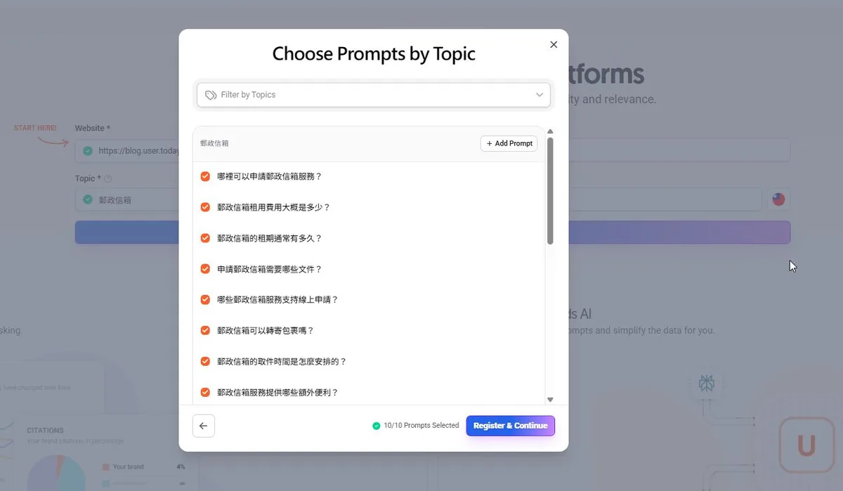 想說一開始還要想消費者會用哪些提示詞,很困擾? 其實 Otterly.AI 有一個 onboarding 流程,只要把品牌名稱和網站網址丟上去,就會生出一些相關的 prompt,我們只要打勾選擇追蹤這些 prompt 就好。
