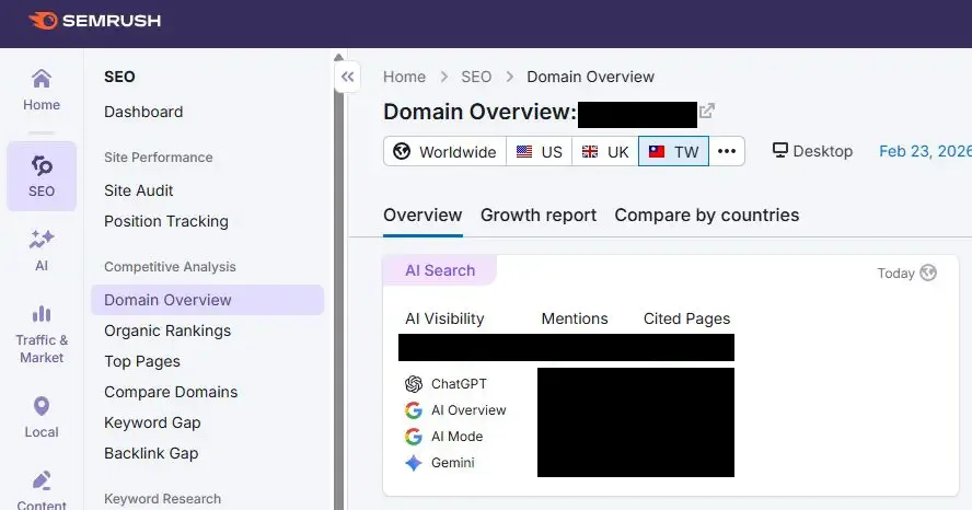 提供一個 AI Brand Visibility Report 功能,可以監測一個網站在 ChatGPT, Perplexity, Gemini, Claude, Grok 等主流 AI 工具的引用狀況。