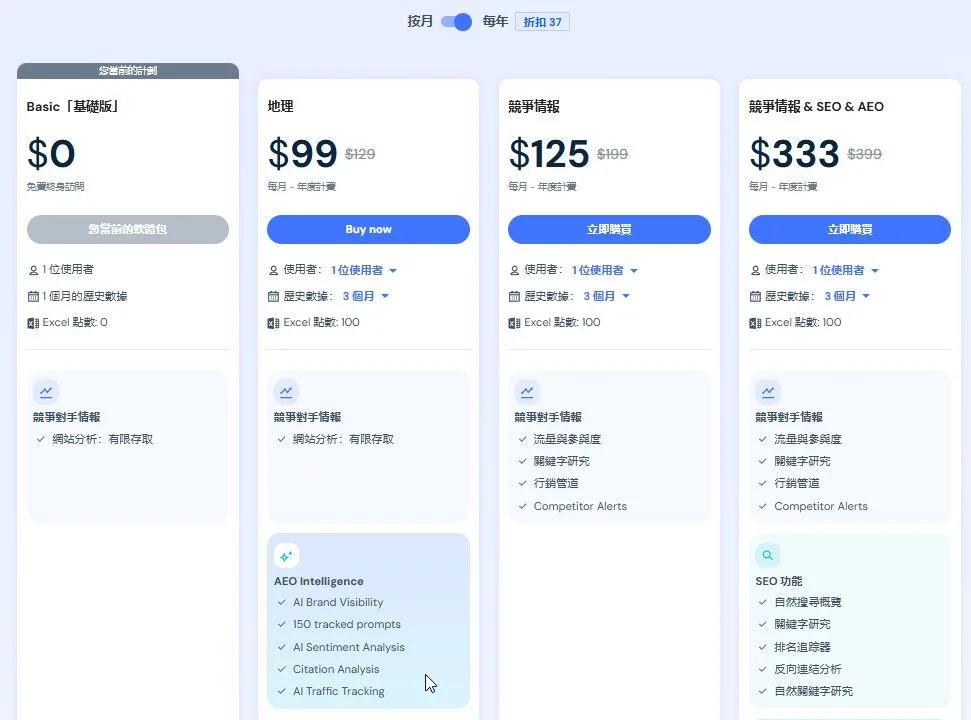 沒有單獨販售,是放在付費訂閱的 Moz Pro 的一個功能,要在月費 $179 美金的 Medium 方案才有 AI Visibility 功能,可免費試用7天。