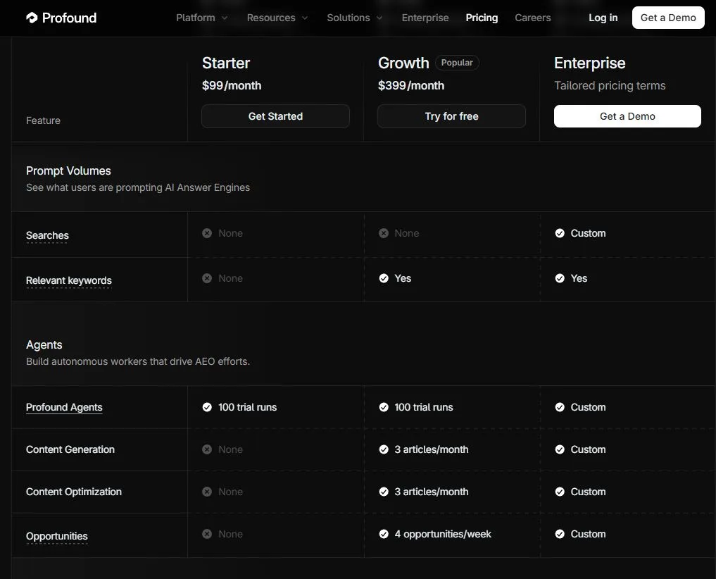 - Profound Agents: 有一個類似 n8n 工作流介面,或是用他們的 Agent templates 範本,自動化生成和優化網站內容。
