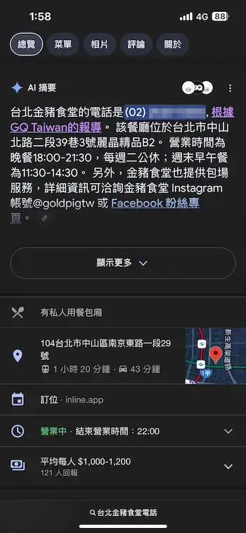 上方截圖是 2025/6 月底截的,那時候 AI Overview 終於開始在台灣地區出現。現在 2025/9 去搜尋同樣的關鍵字,Google AI overview 已經會顯示「沒有公開提供的訂位電話」,非常好,文章內文也沒有特別加註什麼,只能說後來 AI Overview 選中別篇的內容來顯示了。