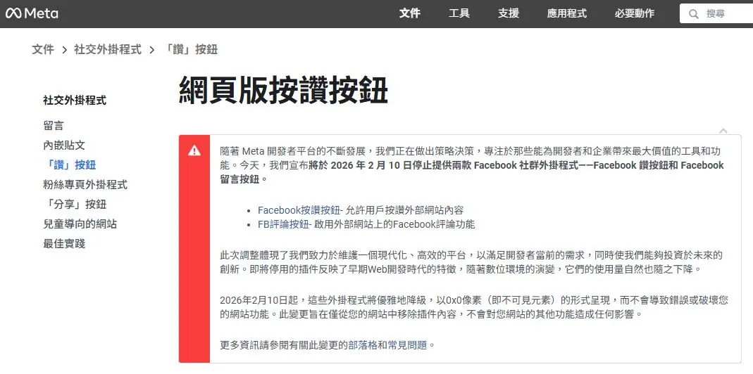 官方公告連結是 Platform Evolution: Facebook Social Plugins to Be Discontinued February 2026,內容大致說為了專注於那些能為開發者和企業帶來最大價值的工具和功能,將於 2026 年 2 月 10 日停止提供兩款 Facebook 社群外掛程式——Facebook Like button 和 Facebook Comment Plugins。