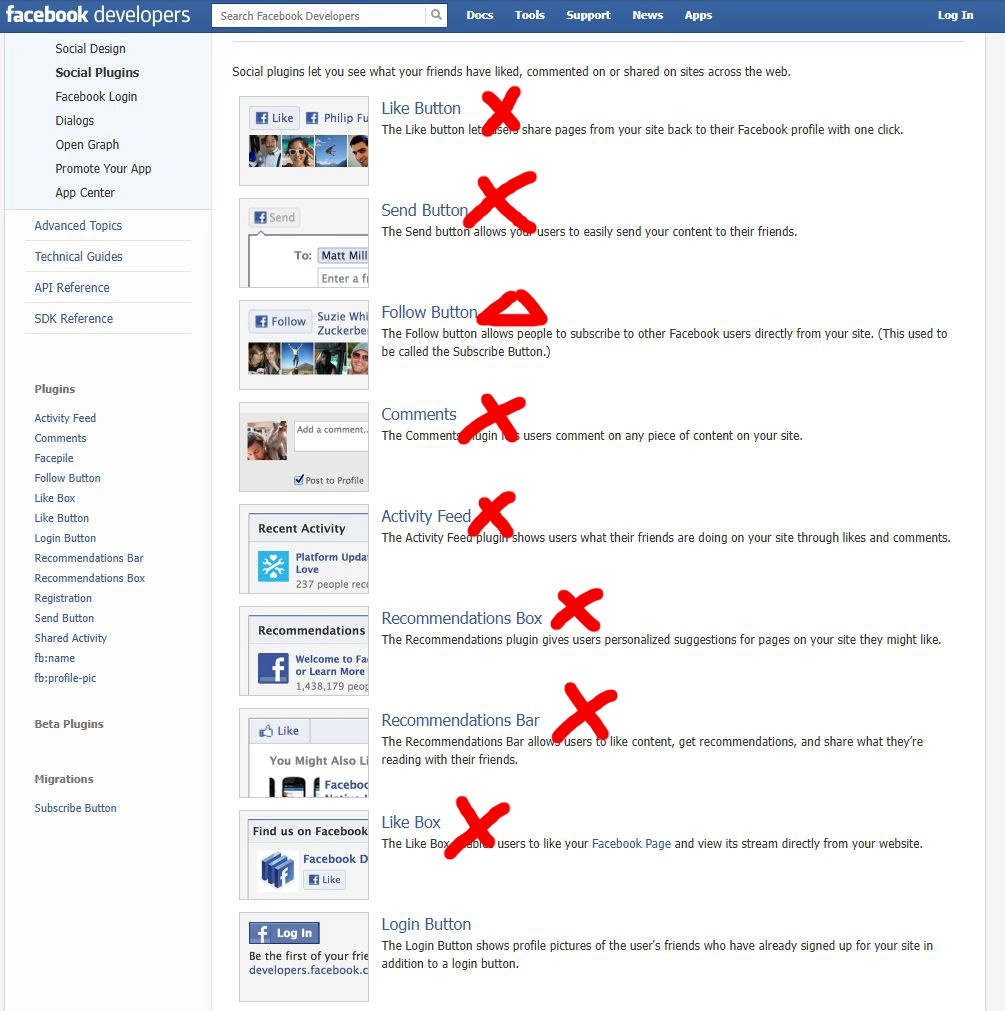 這是一個 2013 年的 Facebook Social Plugins 頁面擷圖,距離十幾年後的 2025/11/11,圖片中僅剩不多還活著的功能,又再被官方幹掉了2個...