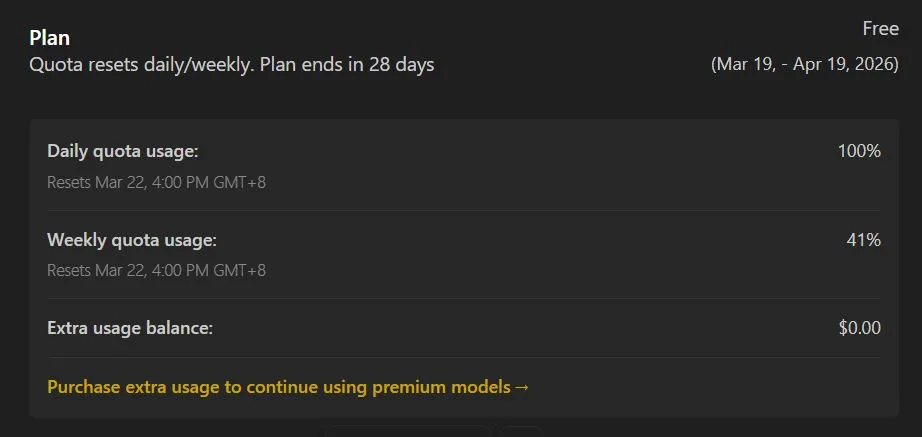 到了 2026 年 3 月中,Google 又直接引進新政策,AI Pro 使用者發現冷卻時間直接從5小時變成5天起跳,例如用到剩 40%,等待幾小時冷卻後,不但沒補滿,冷卻時間還變成5天。